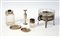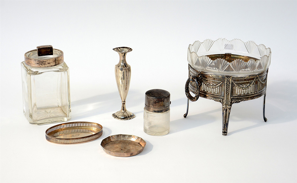 Lotto composto da un'alzatina, un vasetto, un vassoietto e un falconcino portasali in argento e vetro. Manifatture europee del secolo XX (g 280 ca.) (difetti)