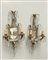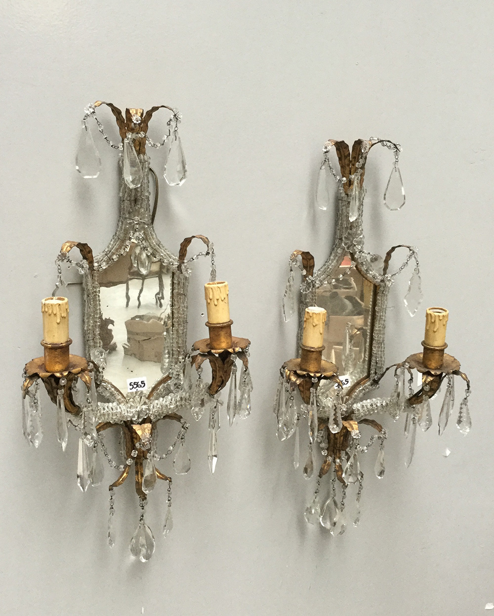 Coppia di appliques a due fiamme con fondo a specchio, struttura in metallo dorato, decorate da perlinature e gocce in vetro (cm 57x28) (difetti)