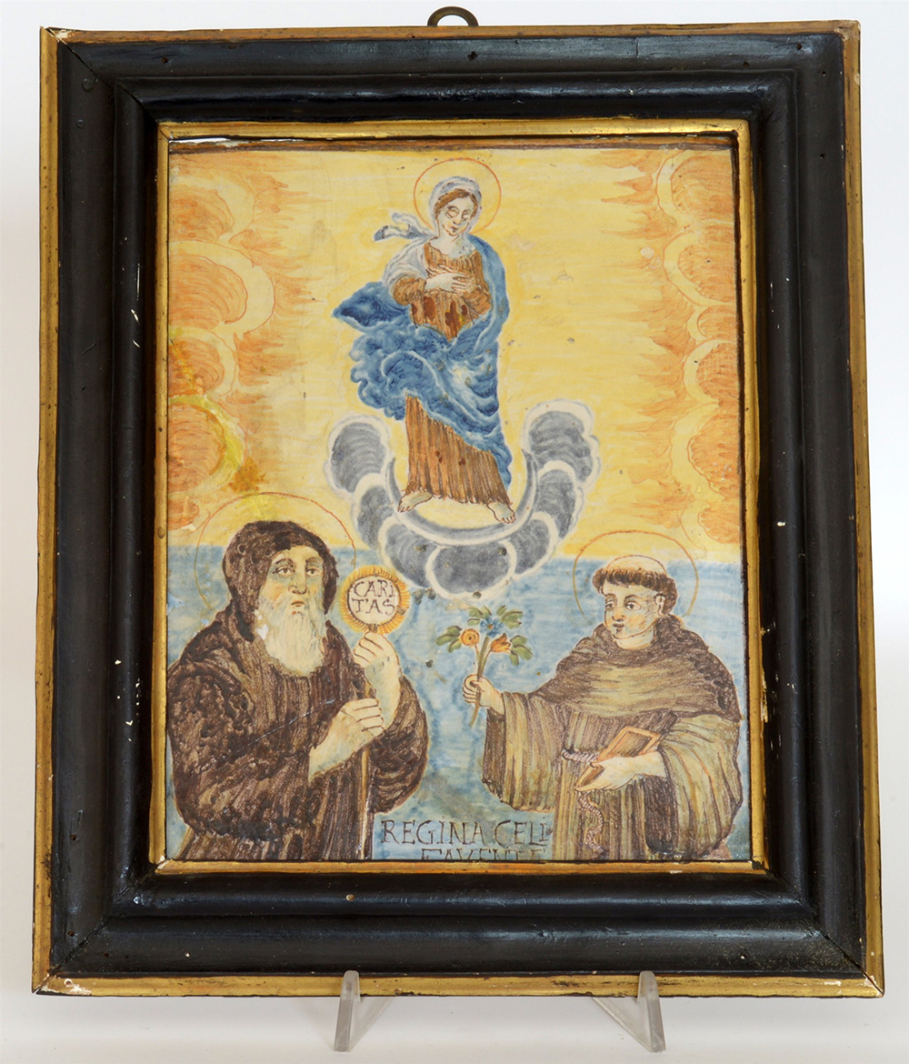 Targa devozionale in maiolica policroma in cornice raffigurante l'ascensione della Madonna fra due Santi francescani. In basso al centro scritta "Regina Celi Faventi" (cm 26.5x20) (restauri)