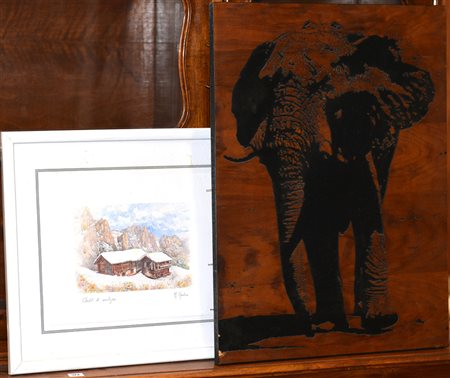 Lotto composto da un acquarello raffigurante baite (cm 23x30) e uno stampo per tessuti raffigurante un elefante (difetti)