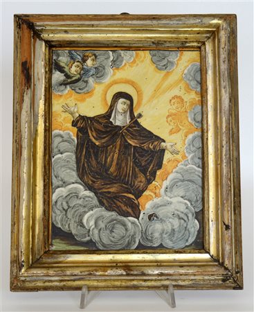 Targa devozionale in maiolica policroma in cornice raffigurante l'apoteosi di santa trafitta da freccia (cm 18x25) (difetti)
