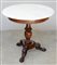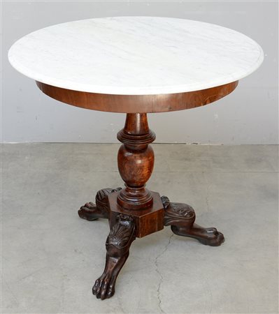 Tavolo tondo con fascia lastronata in noce, gamba centrale tornita terminante a tre piedi sagomati e intagliati terminanti a zampa ferina, piano in marmo bianco, secolo XIX (d cm 88 x h cm 84) (difetti, piano in marmo restaurato)