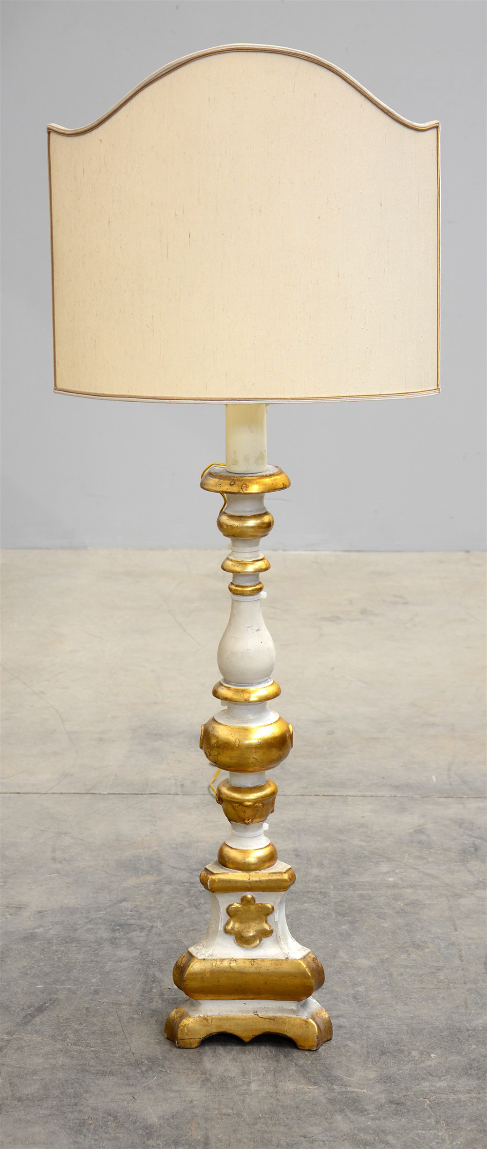 Candeliere in legno tornito intagliato e laccato (h cm 72) sec. XIX. Montato a luce elettrica in epoca posteriore