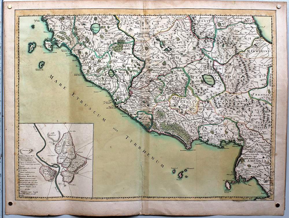 Incisione del secolo XVIII raffigurante la carta geografica dell'Italia centrale (cm 50x67) (difetti)
