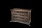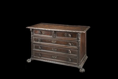 Cassettone in noce a tre cassetti grandi e due sottopiano, maniglie a teste scolpite a tutto tondo, lesene intagliate con cariatidi, profili baccellati. Piedi anteriori ferini. Liguria, sec. XVII (cm 147x90x74) (difetti)