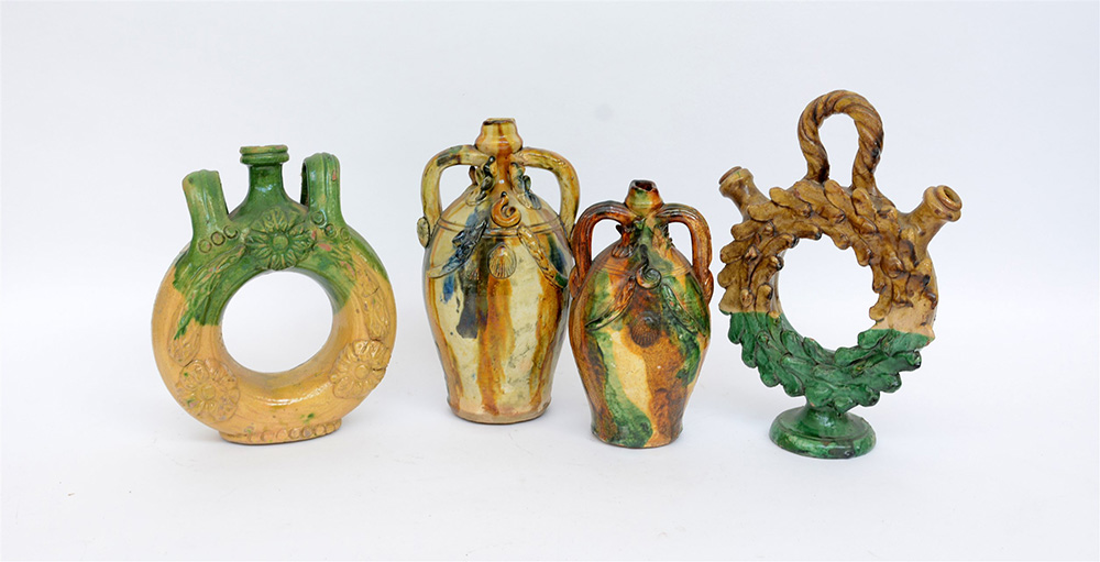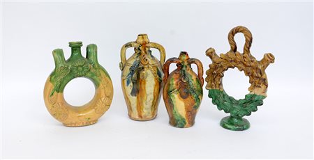 Quattro fiasche policrome in ceramica ingobbiata ed invetriata con applicazioni in rilievo (misure e forme diverse). Italia meridionale, XX secolo (difetti)