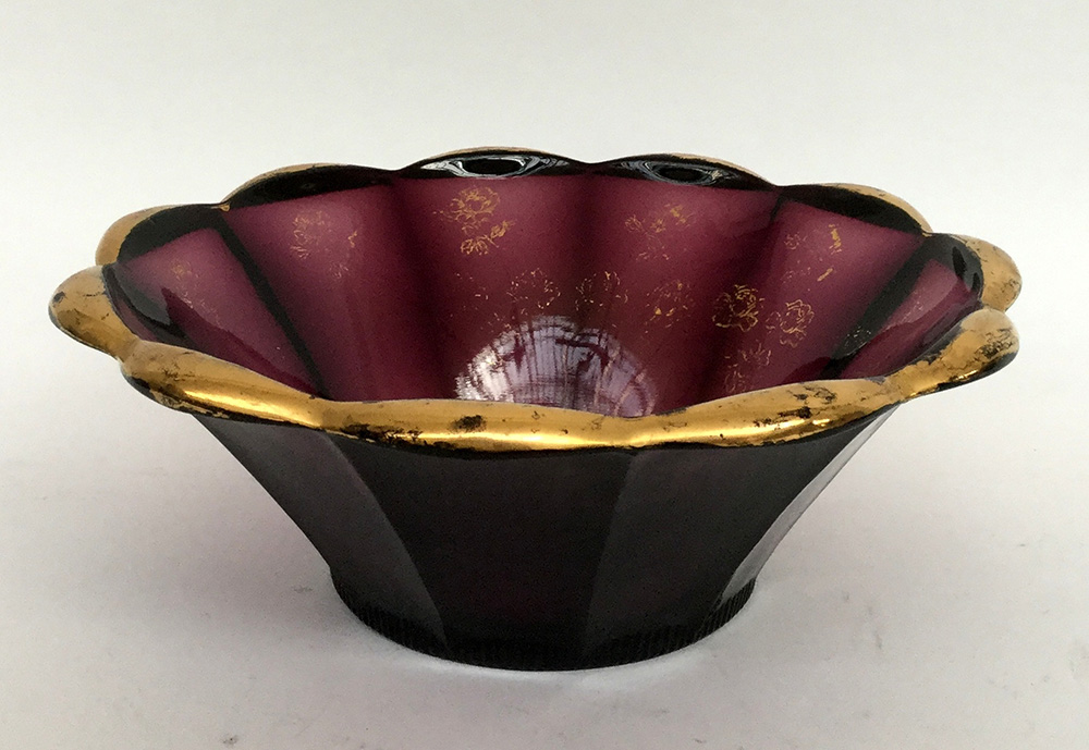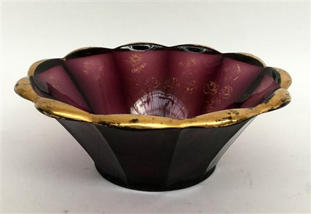 Centrotavola in vetro trasparente ametista con piccoli decori in oro (d cm 25) (difetti)