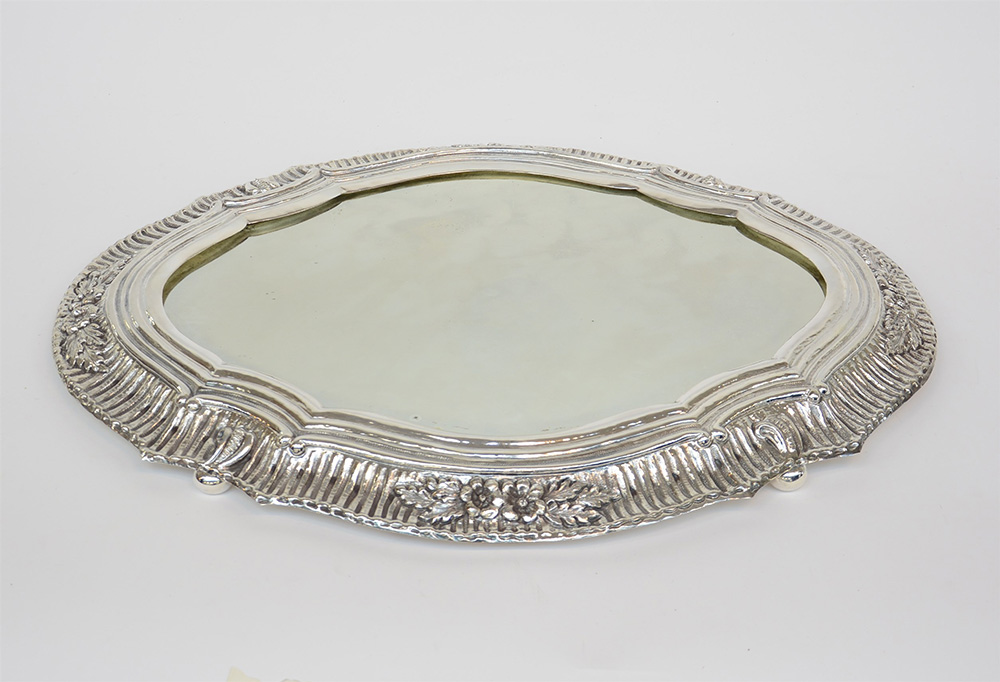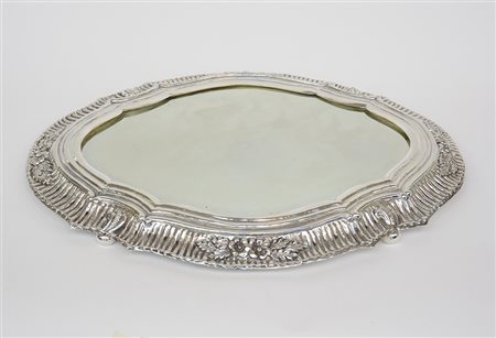 Centrotavola di forma sagomata in metallo argentato decorato in rilievo con piano a specchio (cm 63x48) (lievi difetti)