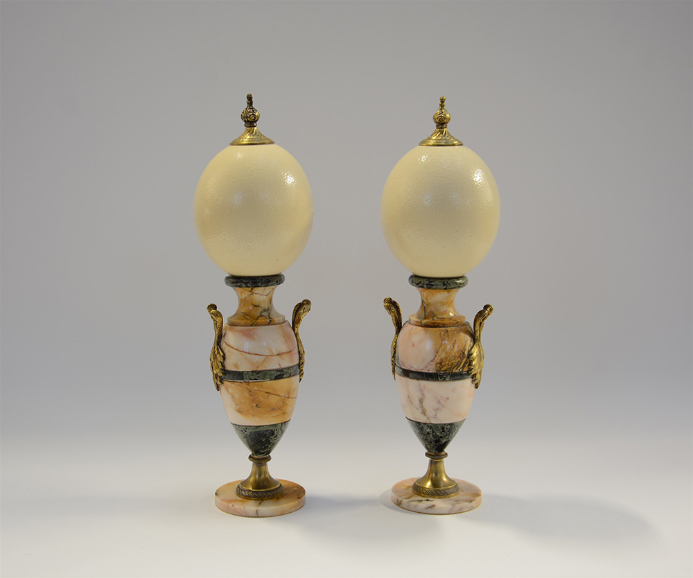 Coppia di elementi ornamentali a forma di vasi a sezioni di marmi differenti, sormontati da uova di struzzo, anse in metallo dorato. Sec. XX (h cm 45)(lievi difetti)