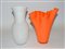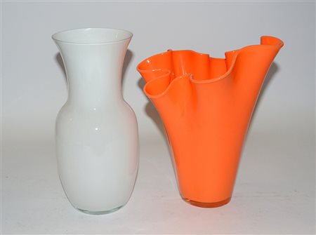 Lotto composto da un vaso a fazzoletto in vetro opacizzato arancione e un vaso a balaustro in vetro opacizzato bianco, misure diverse