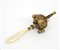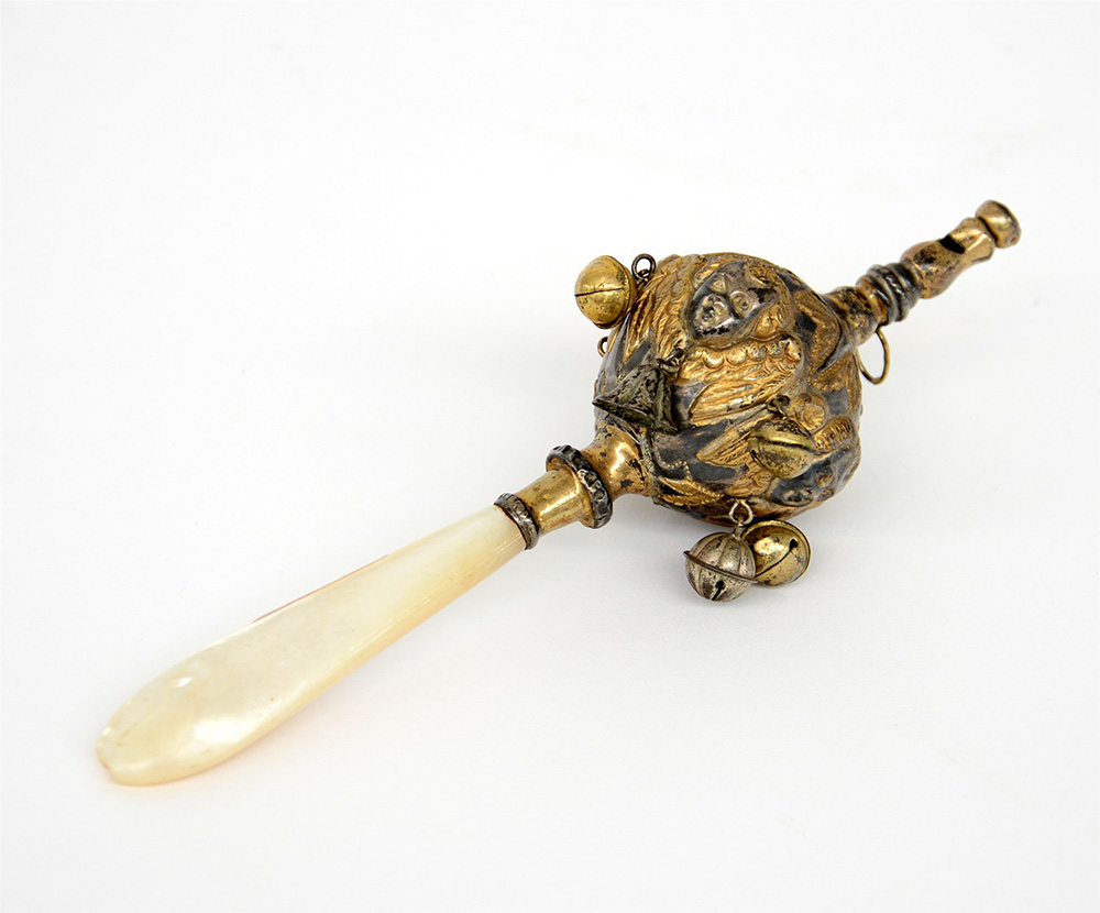 Sonaglio per bambini in argento parzialmente dorato di forma sferica con cherubini sbalzati, campanellini e fischietto; manico in madreperla. Francia, fine XIX-inizi XX secolo (g lordi 41 ca) (l 15,5 ca)