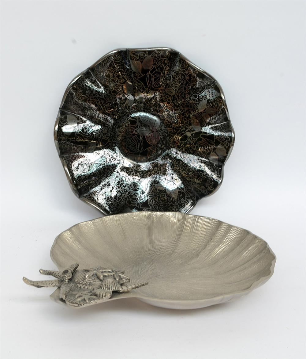 Lotto composto da un centrotavola a fazzoletto in vetro ametista con applicazioni in foglia d’argento e un centrotavola in alluminio a valva di conchiglia (l max cm 40) (lievi difetti)