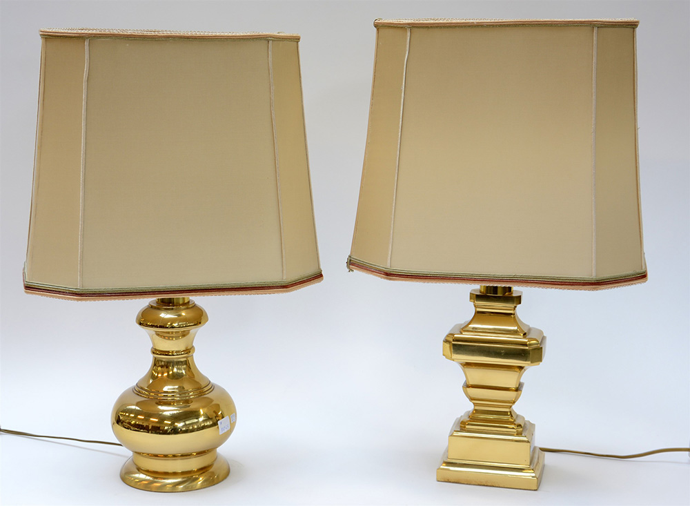 Lotto di due lampade in ottone a base tonda e rettangolare complete di paralumi (h tot cm 56) (lievi difetti)