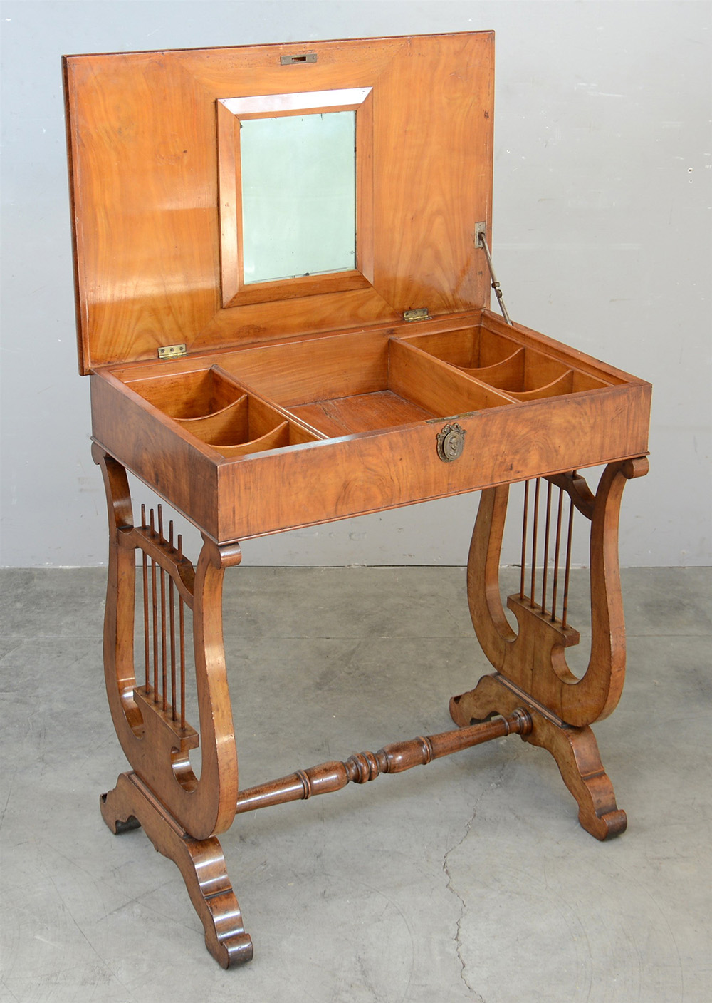 Tavolo toilette in noce con gambe a lira riunite da traversa tornita. Secolo XIX (cm 72x79x46)