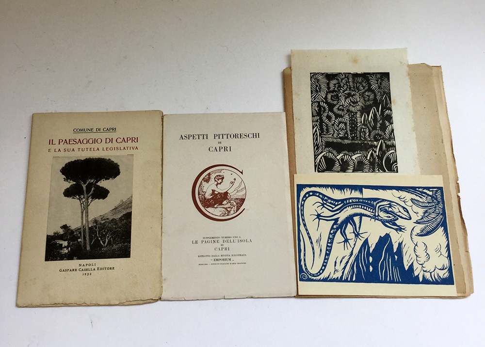 Lotto composto da alcune pubblicazioni su Capri del 1922, tra cui un articolo di Marinetti con riproduzione di un disegno di E. Prampolini. Tre fascicoli (difetti)