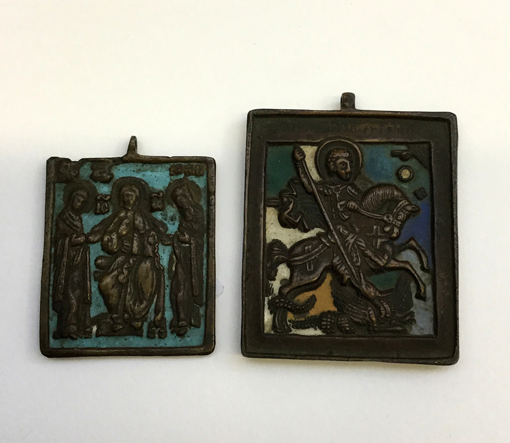 Lotto composto da due piccole icone a ciondolo raffiguranti "San Giorgio a cavallo" e "Santi" parzialmente smaltate. Russia secolo XIX, misure differenti (max cm 6x5)