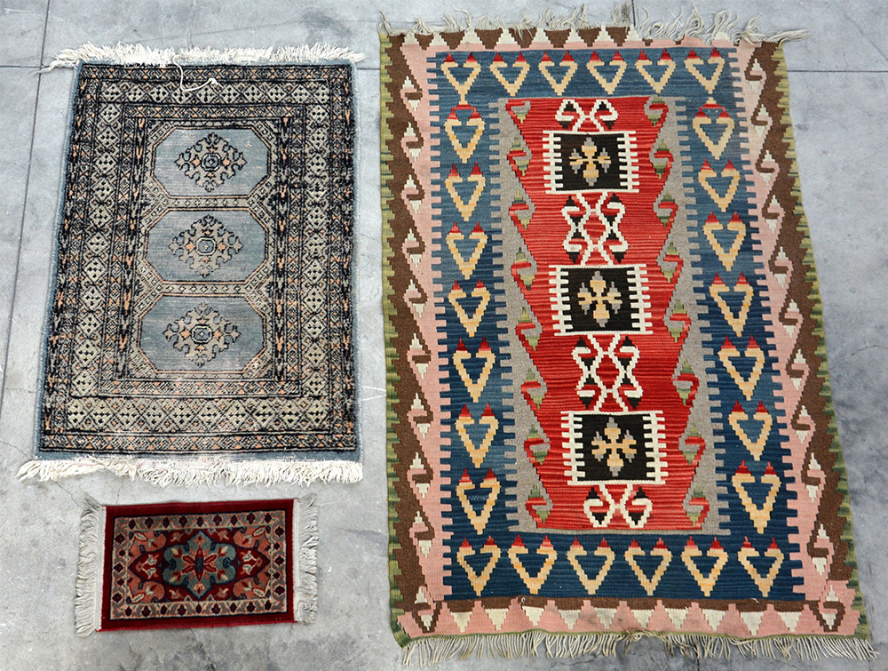 Lotto di tre tappeti orientali, di cui il più grande un tappeto Kilim Anatolia(max cm 70x100) (difetti)