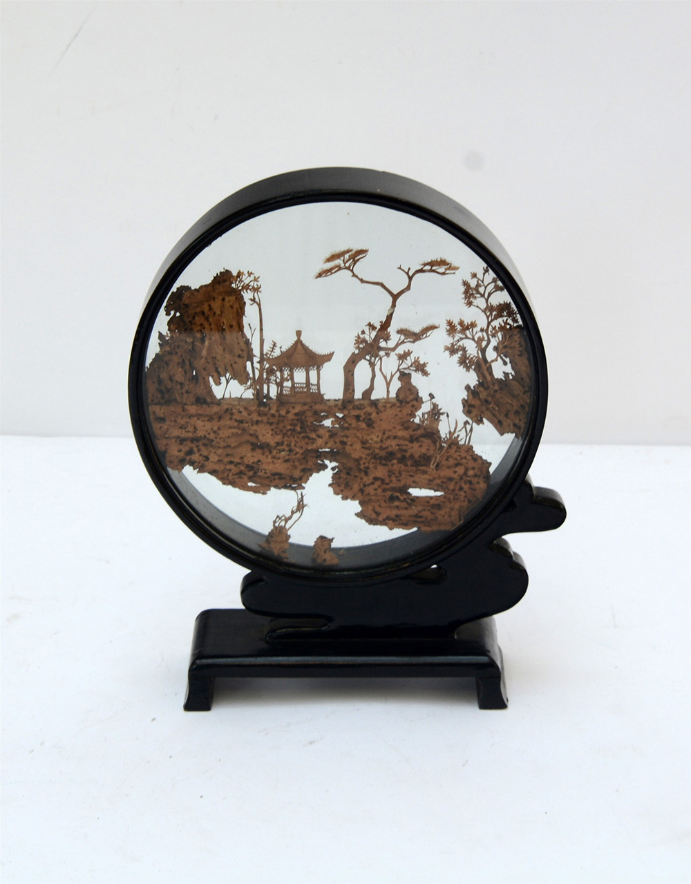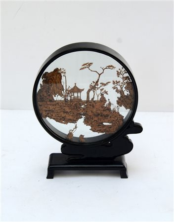 Arte orientale, composizione in sughero intagliato raffigurante un paesaggio contenuto in teca in legno ebanizzato (h cm 22) (difetti)