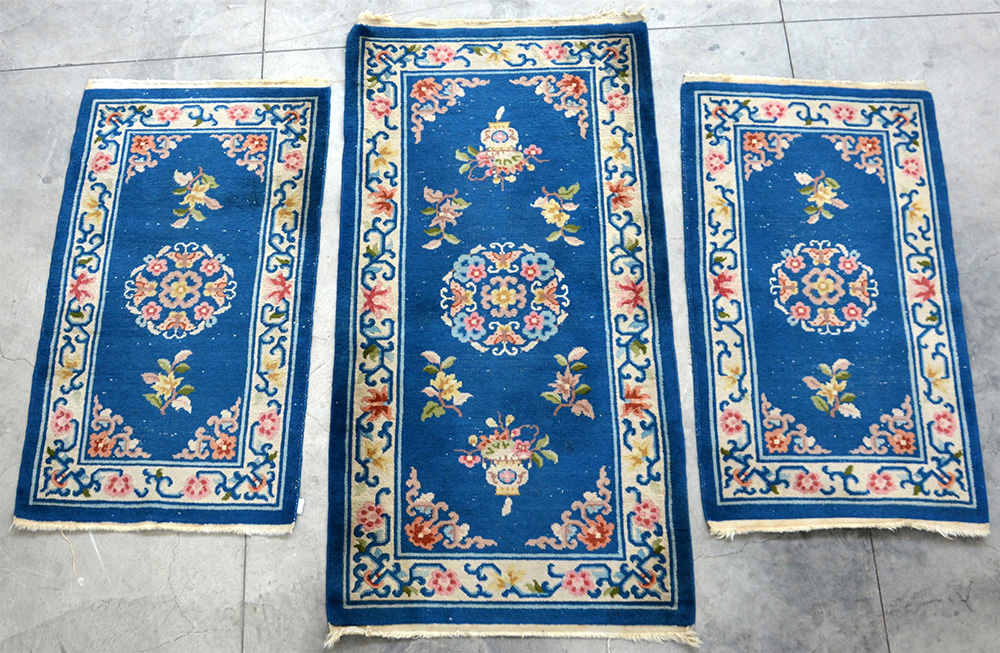Lotto di tre tappeti cinesi a fondo azzurro.(max cm 192x94) (difetti)