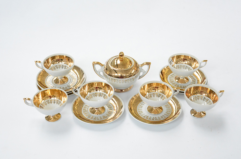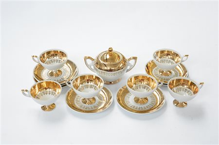 Servizio composto da una zuccheriera, sei tazzine con piattini decorato in oro