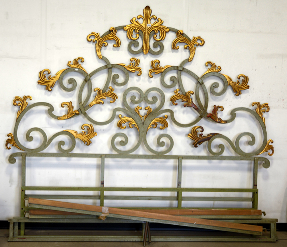 Letto in ferro battuto laccato verde e oro. Testata a girali (cm 180x170) (difetti)