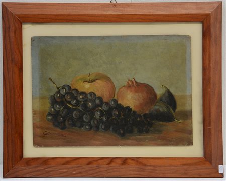 "Uva, mela, fichi e melograno" olio su compensato (cm 24x35) firmato in basso a sinistra, in cornice (difetti)