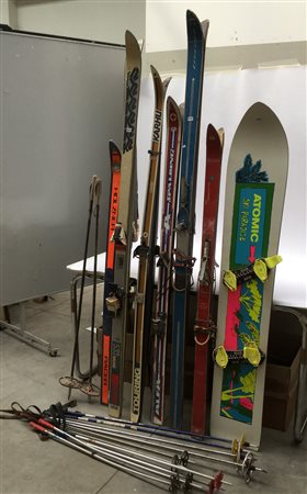 Lotto composto da numerosi sci e racchette di diversa epoca (difetti)