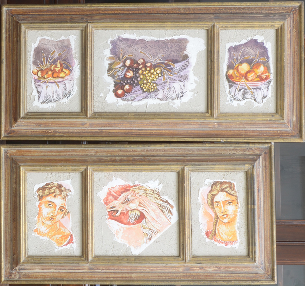 Affreschi, coppia di trittici in cornici (cm 30x90). Etichette al retro