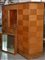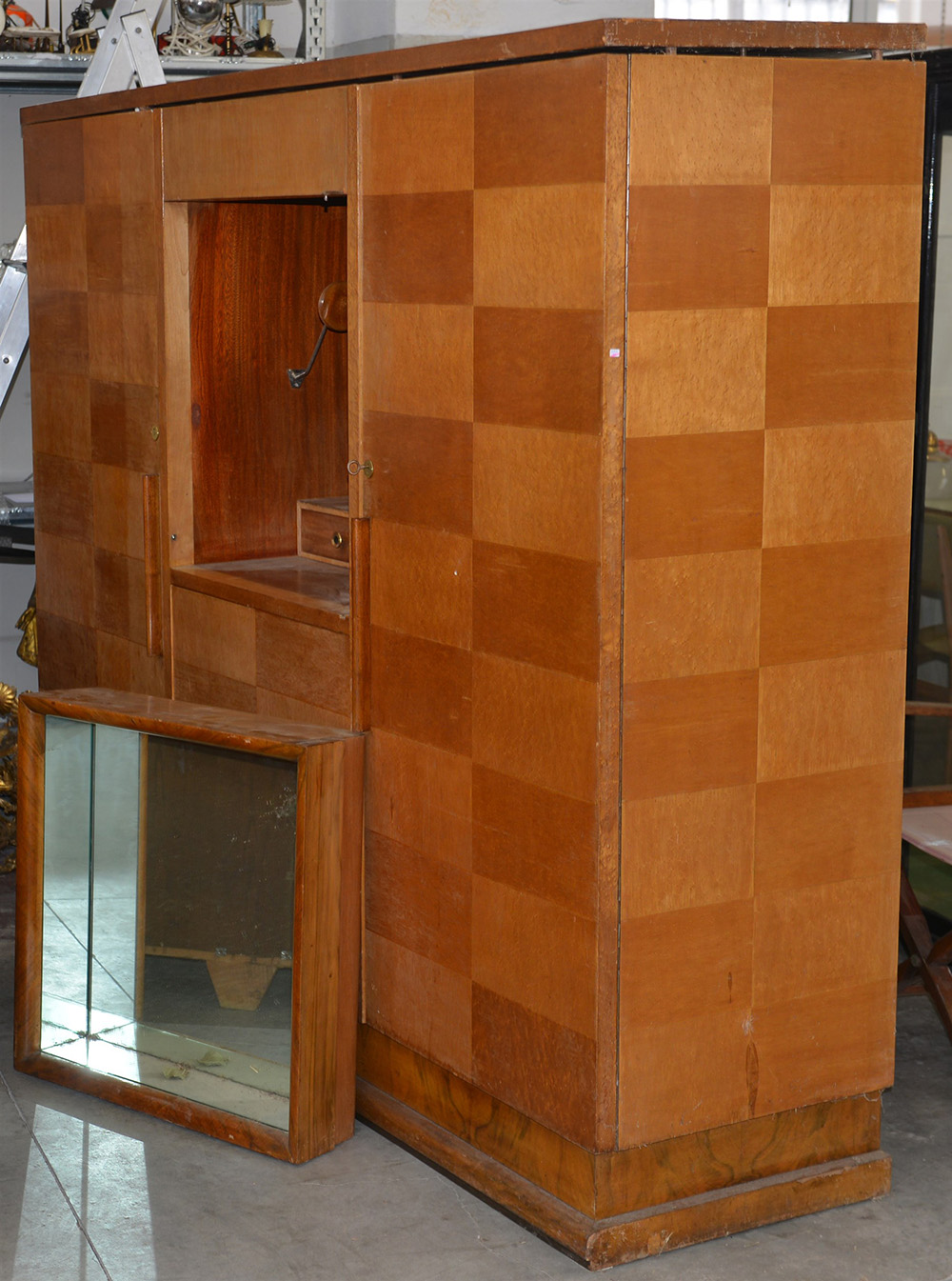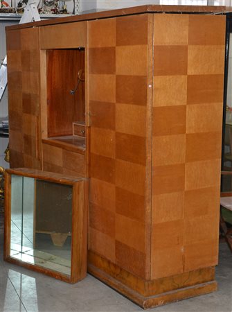 Armadio radicato e filettato a due ante laterali, parte centrale a due ante sovrapposte, di cui quella superiore con specchio interno. Anni '40. (cm 210x182x60) (difetti)
