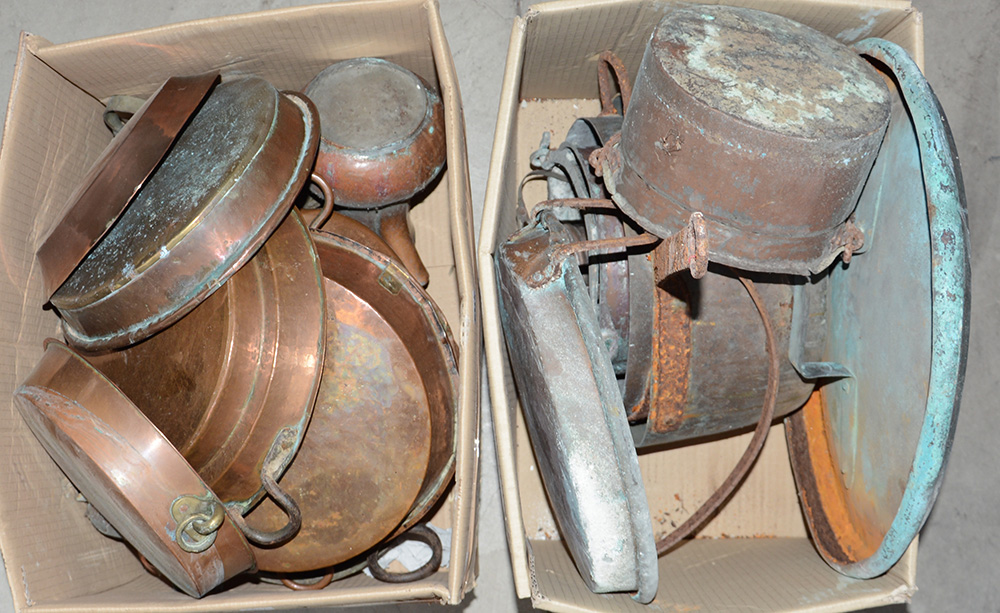 Due scatoloni contenenti numerosi oggetti in rame (difetti)