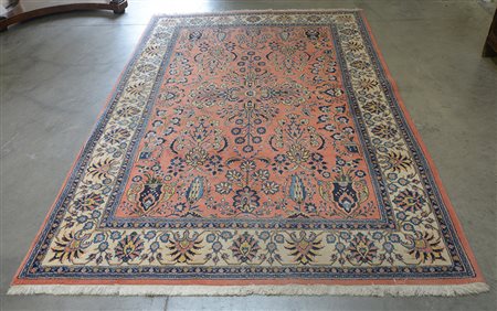 Tappeto Sarouk, Persia, secolo XX. Disegno floreale policromo su fondo color rosa salmone. Bordura Herati su fondo bianco (cm 266x170) (difetti)