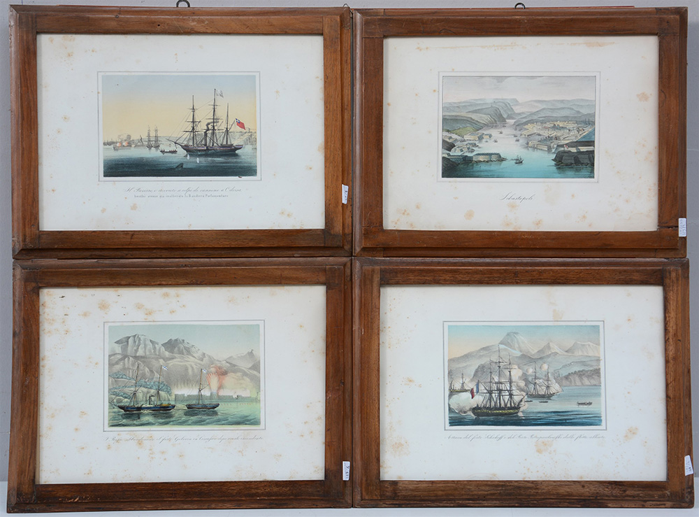 Gruppo di quattro incisioni a colori del secolo XIX raffiguranti paesaggi e scorci portuali con velieri (cm 23x33) in cornici (difetti)