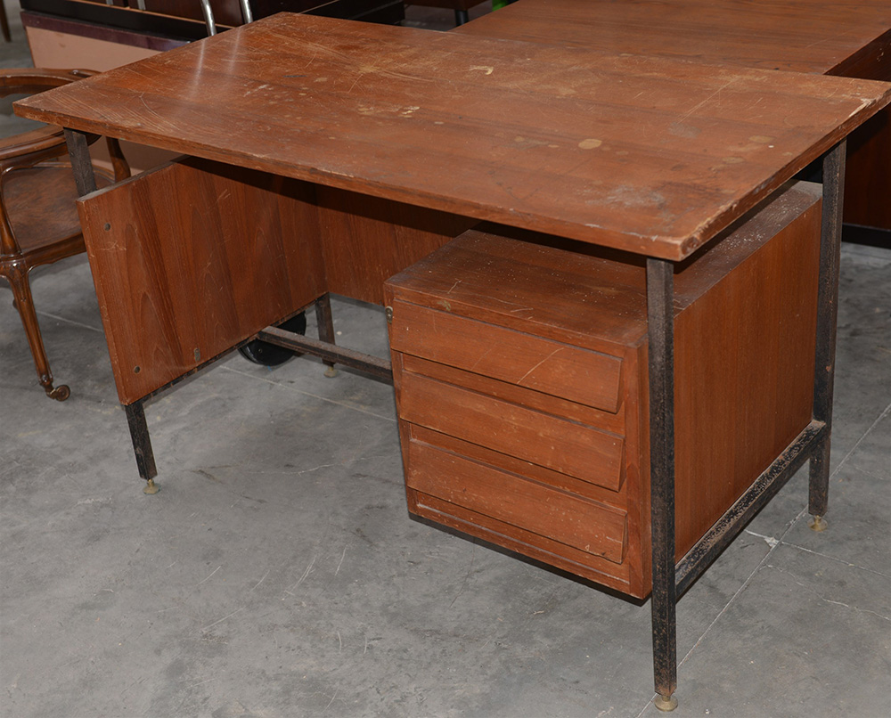 Scrivania in legno teak a tre cassetti laterali con struttura in metallo. Anni '60. (cm 125x78x65) (difetti e mancanze)