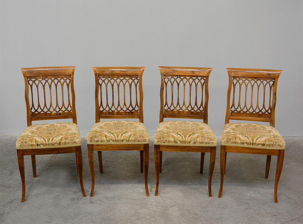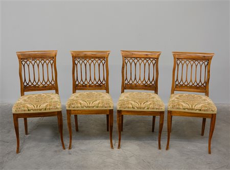 Gruppo di quattro sedie in legno con gambe mosse, schienale a giorno con cartelle intagliate a ringhiera, secolo XX (difetti)