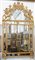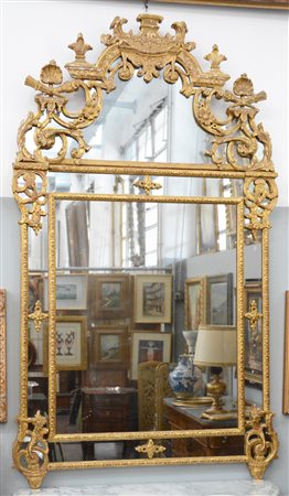 Grande specchiera in legno intagliato e dorato con cimasa ed angoli mossi, decorata con volute, fiori, fiaccole e conchiglie (cm 112x195) (difetti)