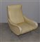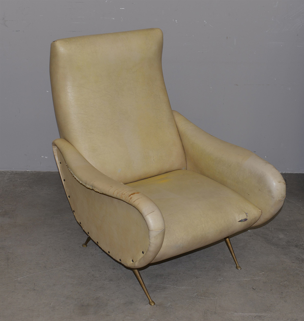 Poltrona con schienale e braccioli curvi, gambe in fusione di ottone rivestita in sky beige. Anni '50. (difetti)