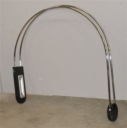 Lampada a soffitto con struttura in acciaio cromato ricurvo, sostegno e plafoniera in metallo laccato nero modello "Gesto". Produzione Skipper, Italia, 1975. (difetti)