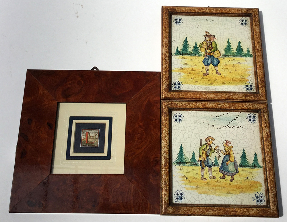 Lotto composto da due piastrelle di Delft e un'incisione. In cornici
