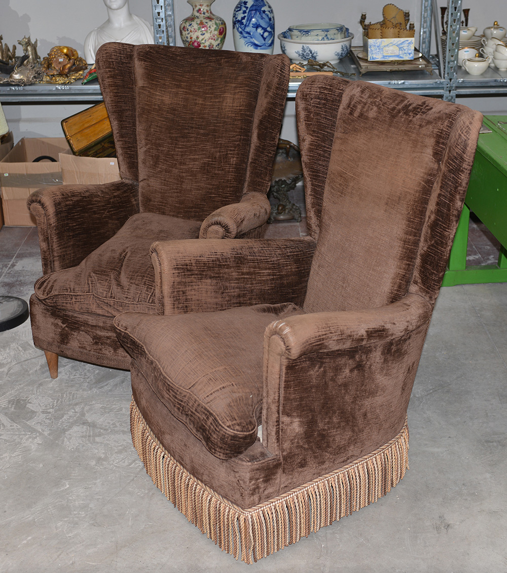 Coppia di poltrone imbottite ì, on piedini rastrtemati e rivestite in velluto marrone. Italia, anni '50. (difetti)