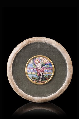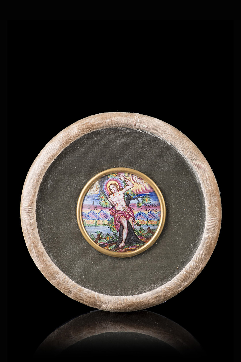 Arte del secolo XVIII "San Sebastiano" placca smaltata (d. cm 5) siglata e datata I S K 1723 (difetti)