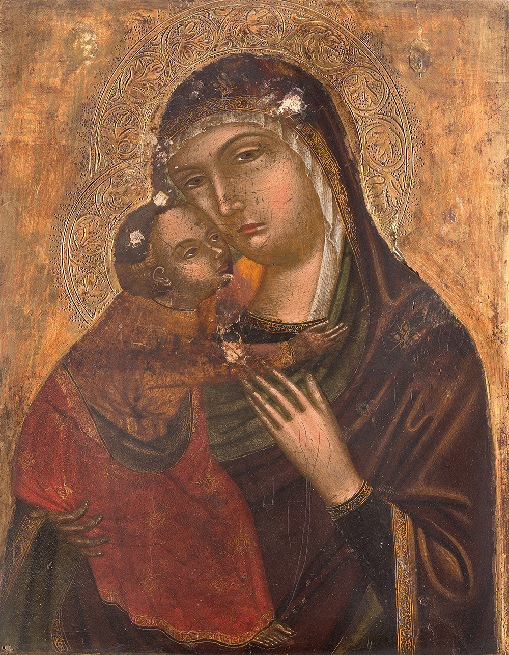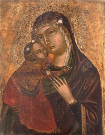 Scuola veneto-cretese del secolo XVII 'Madonna con Bambino'' a fondo oro, olio su tavola (cm 34x27) (difetti)