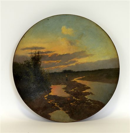 Coriolano Vighi (Firenze 1852 - Bologna 1905)"Paesaggio al tramonto" piatto...