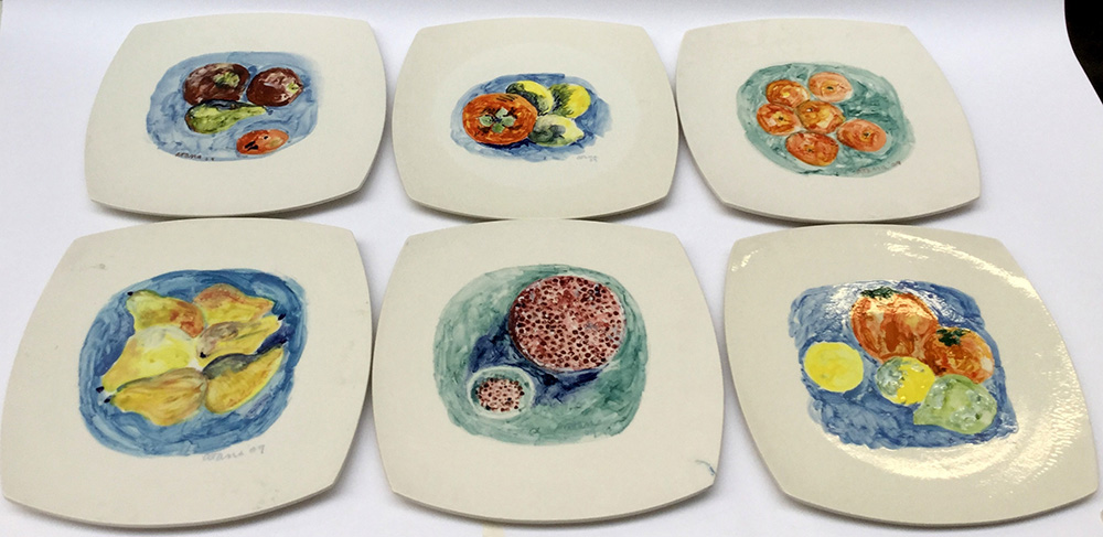 Firma indecifrata, sei piatti decorati al centro da frutti