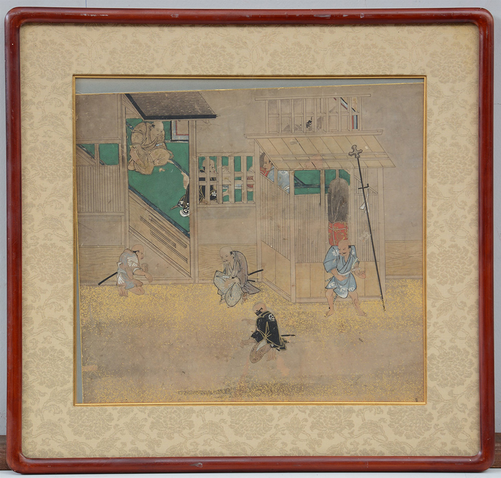 AFrammento di rotolo orizzontale raffigurante samurai, inchiostro e colore su carta, con cornice (difetti)