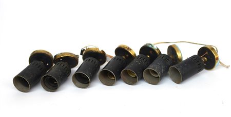 Gruppo di sette appliques in ottone con portalampade in metallo dipinto nero....