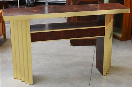 Consolina in legno tricolore impiallacciato in finta radica rivestiti in alluminio ottonato. Anni '80. (cm 130x78x32) (difetti)