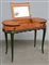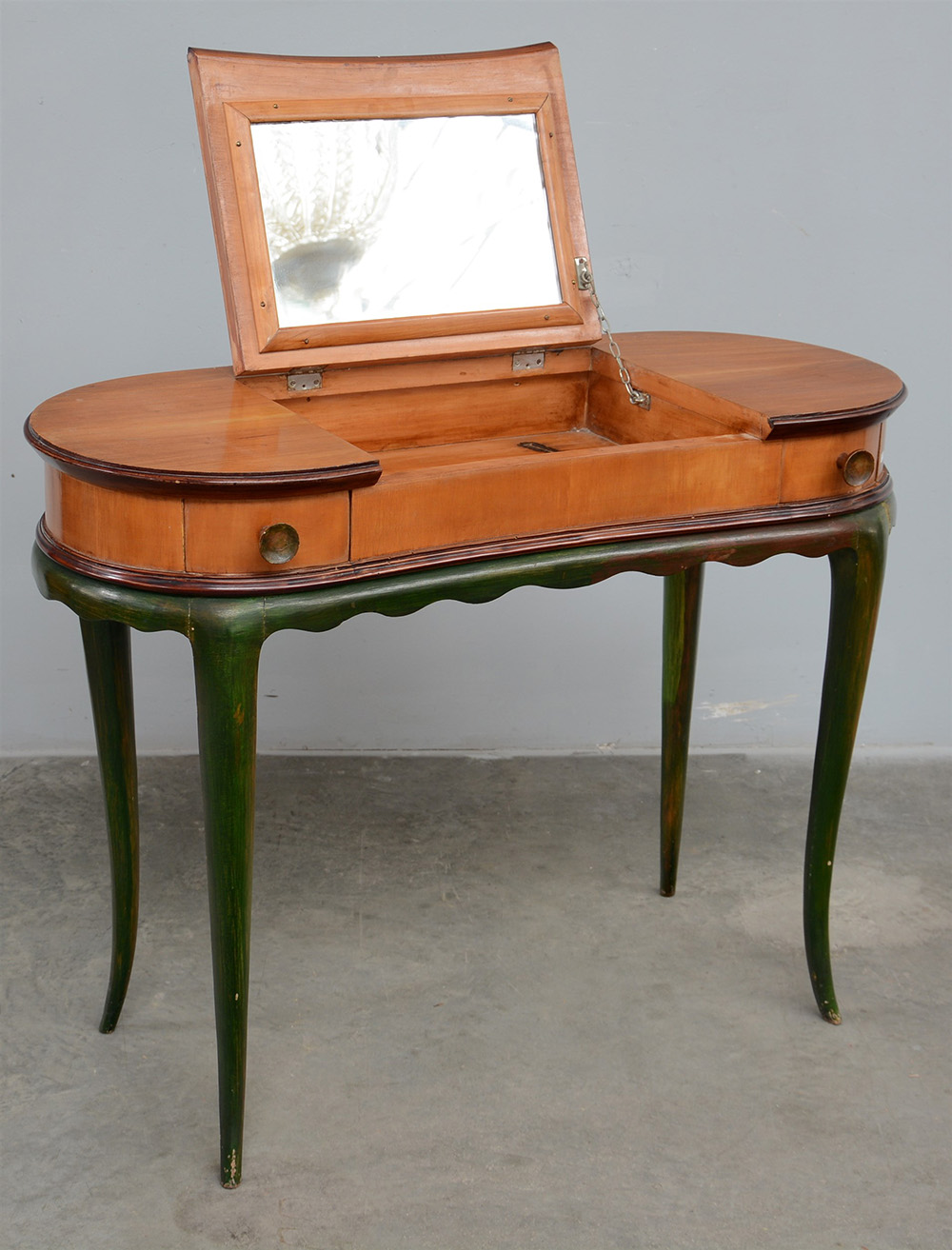 Toilette a fagiolo impiallacciata in legno chiaro con gambe mosse tinte in verde, due cassetti nella fascia e piano sollevabile con specchio, fine anni ‘30 (cm 101x76x45) (difetti)