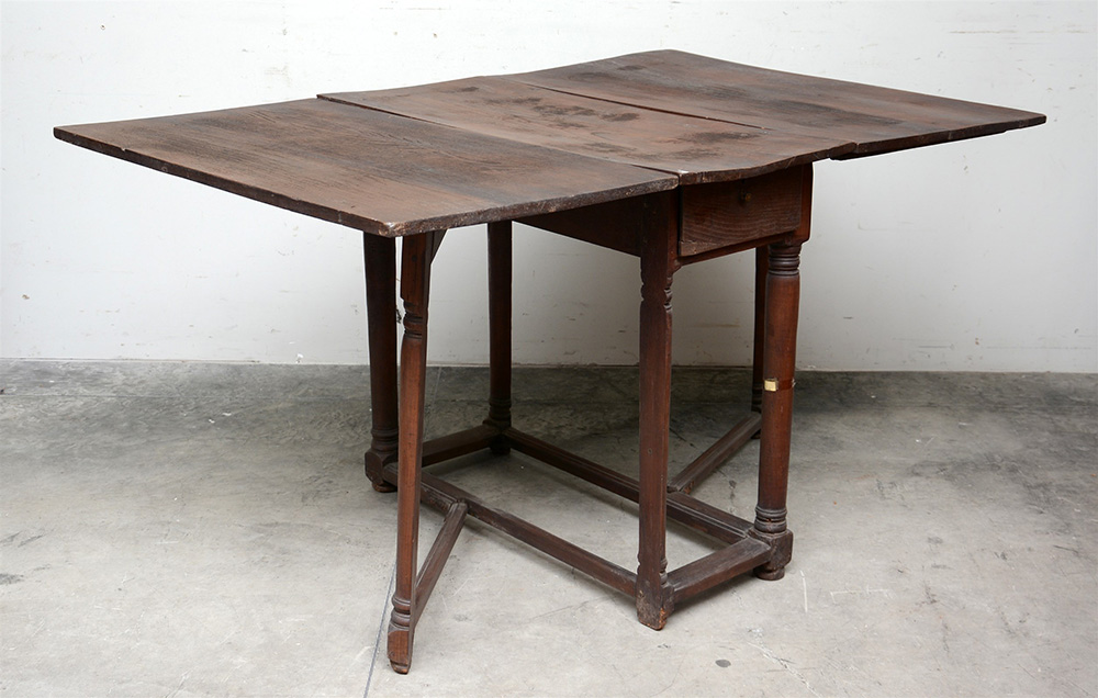 Tavolo rustico a bandelle in legno di castagno con gambe tornite e un cassetto nella fascia (aperto cm 141x77x96, chiuso cm 43x77x96) (difetti)