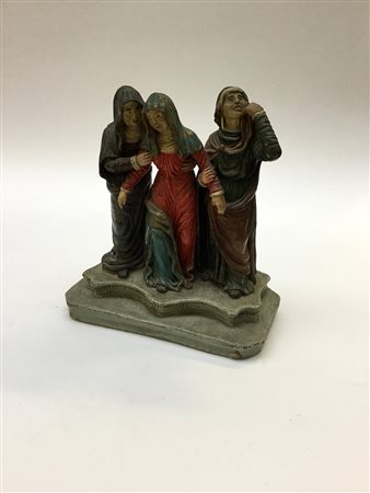 "Le tre Marie" gruppo scultoreo in terracotta dipinta in policromia, firmato sulla base (h cm 26) (difetti)