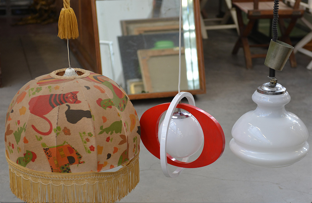 Lotto di tre lampadarietti in legno laccato, vetro lattimo, metallo e stoffa. Anni '70. (difetti)